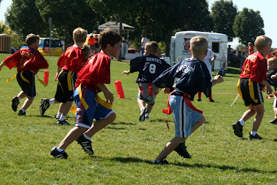 If you were to ask us what we're up to these days, chances are it will have something to do with football. Dallin is playing tackle, which means practices Tuesday thru Friday. Brady is on a flag team and he practices twice a week (luckily at the same time and in the same neighborhood as Dallin.) Mallory is cheering for the middle school, requiring practices at 6:00 am and cheering at one or two football games a week. Of course I'm usually the one driving them all. On Saturdays we go from one boy's game to the next, followed by cheering on our sad little BYU Cougars who are currently 1-3. That's OK, Mark still proudly flies his flag every Saturday morning. When the boys aren't actually playing football they are collecting football trading cards or playing NCAA football on the XBox. And when Mark isn't commiserating about another BYU loss he's keeping up to date on the Cougar message boards online. So yeah, pretty much we're all about football right now. (Except for Kenzie...she'll have nothing to do with the sport.)